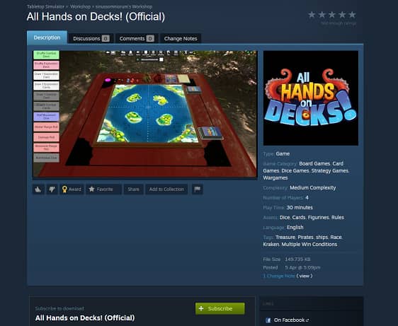 Okay, this is a pretty niche availability, but it’s a start! One day we might have a free mod on Boardgame Arena, but for now we’re using what we can to give you the chance to try the game out. Follow this link to go to the Steam workshop page, or search for All Hands On Decks! on the Tabletop Simulator workshop. Simply hit the +Subscribe button on the mod page and it’ll install when you next launch the game.